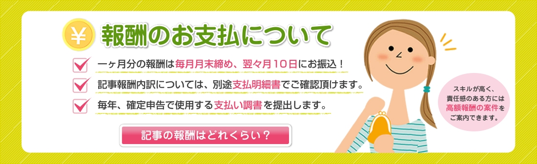 報酬は、1カ月分の記事報酬をまとめて翌月月末に支払わせていただいております。1カ月分の記事報酬内訳については、別途支払明細書にてご確認いただき、問題がなければ指定の口座へ振り込ませていただきます。
